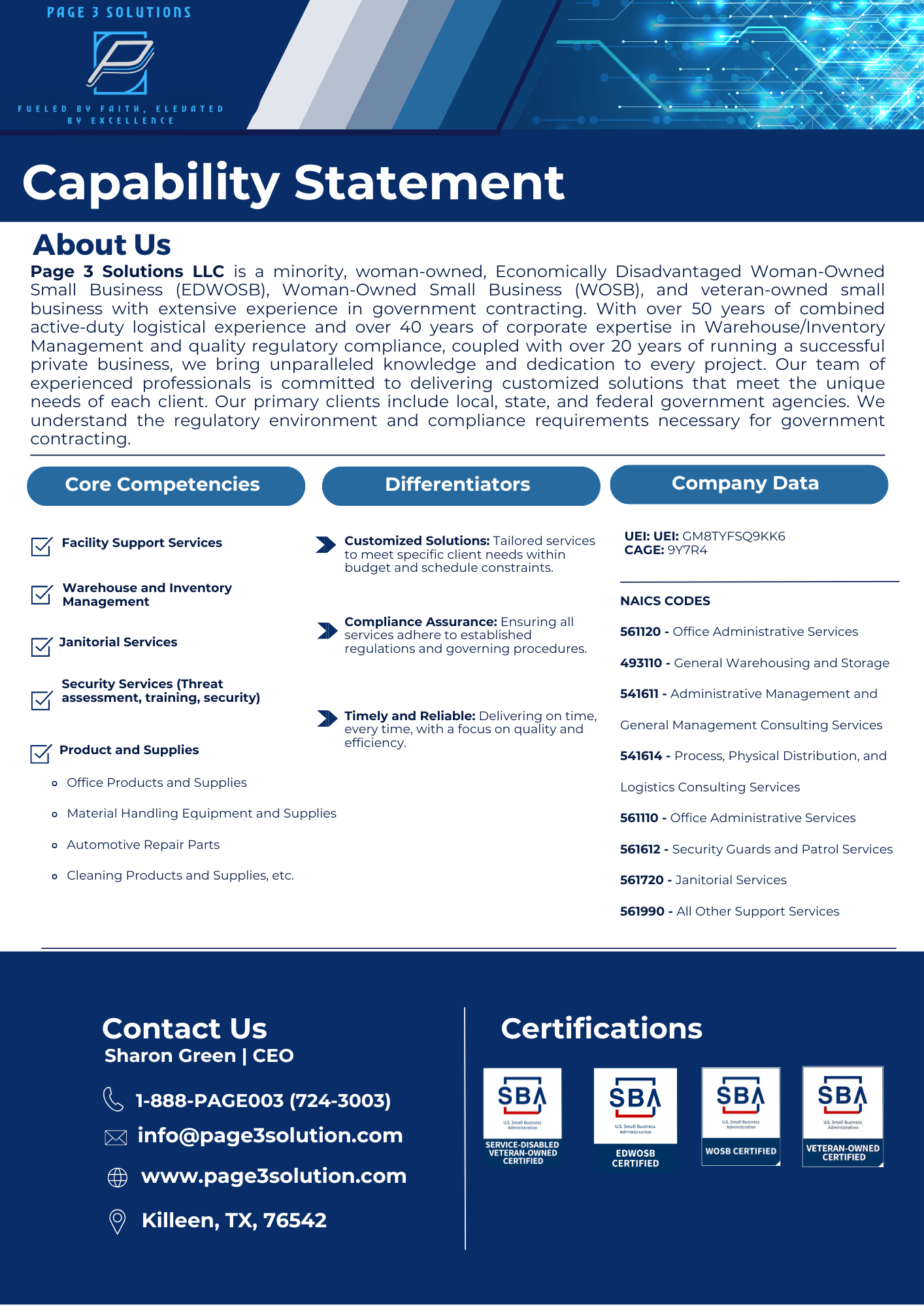 Page 3 Solutions, LLC is a minority, woman, service-disabled veteran-owned business that provides comprehensive facility support, security, and logistical services to local, state, and federal government agencies. Our commitment to excellence, integrity, and reliability drives us to deliver high-quality solutions that meet our clients’ unique needs.